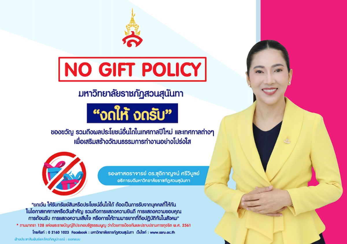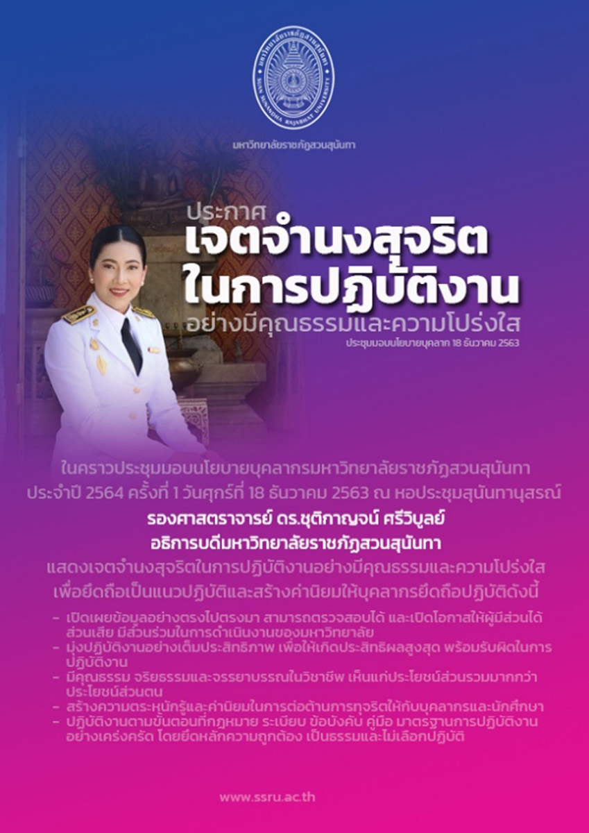 ตามวิสัยทัศน์ของมหาวิทยาลัยราชภัฏสวนสุนันทา “มหาวิทยาลัยแม่แบบที่ดีของสังคม” เพื่อสร้างความเชื่อมั่นแก่ท้องถิ่น และสังคม มหาวิทยาลัยราชภัฏสวนสุนันทา พร้อมที่จะมุ่งมั่นในการ บริหารงานตามหลักธรรมาภิบาล ดังนั้นอธิการบดีในฐานะผู้บริหารสูงสุดของมหาวิทยาลัยราชภัฏสวนสุนันทา จึงขอแสดงเจตจํานงสุจริตในการปฏิบัติงานอย่างมีคุณธรรมและความโปร่งใส เพื่อยึดถือเป็นแนวปฏิบัติ และสร้างค่านิยมให้บุคลากรมหาวิทยาลัยราชภัฏสวนสุนันทายึดถือปฏิบัติดังนี้